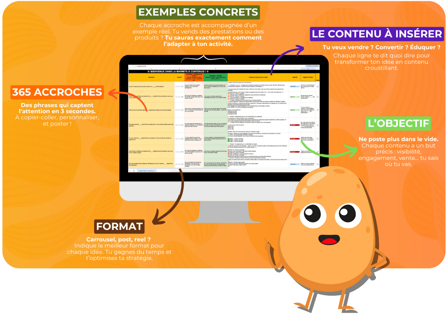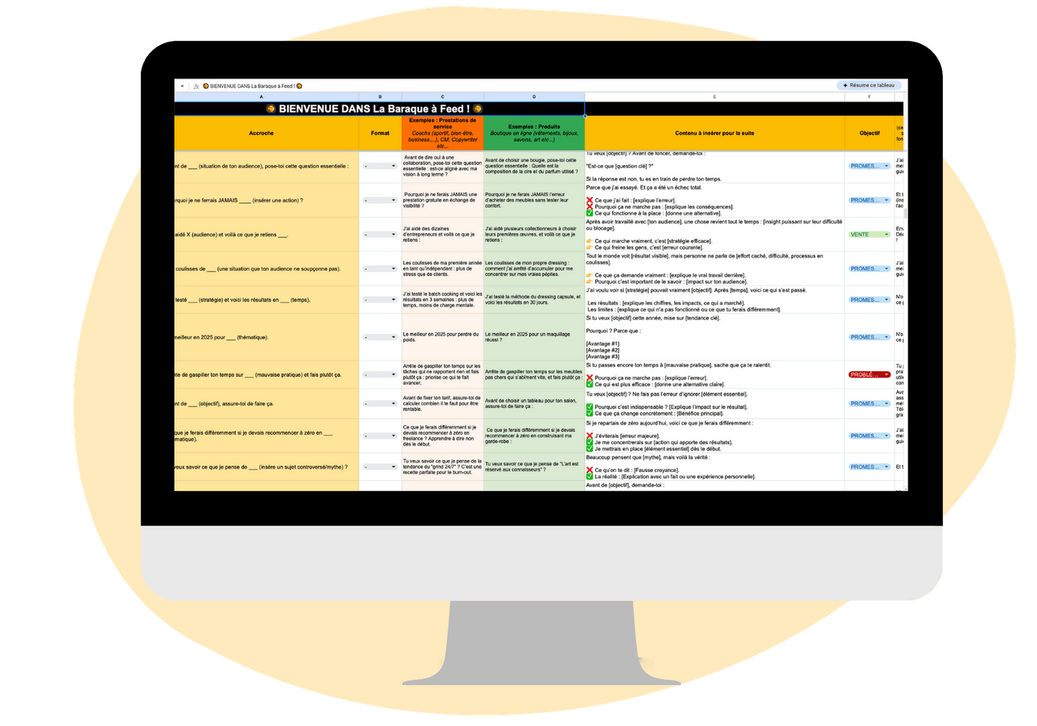 Le contenu à insérer : Tu veux vendre ? Convertir ? Éduquer ?Chaque ligne te dit quoi dire pour transformer ton idée en contenu croustillant.